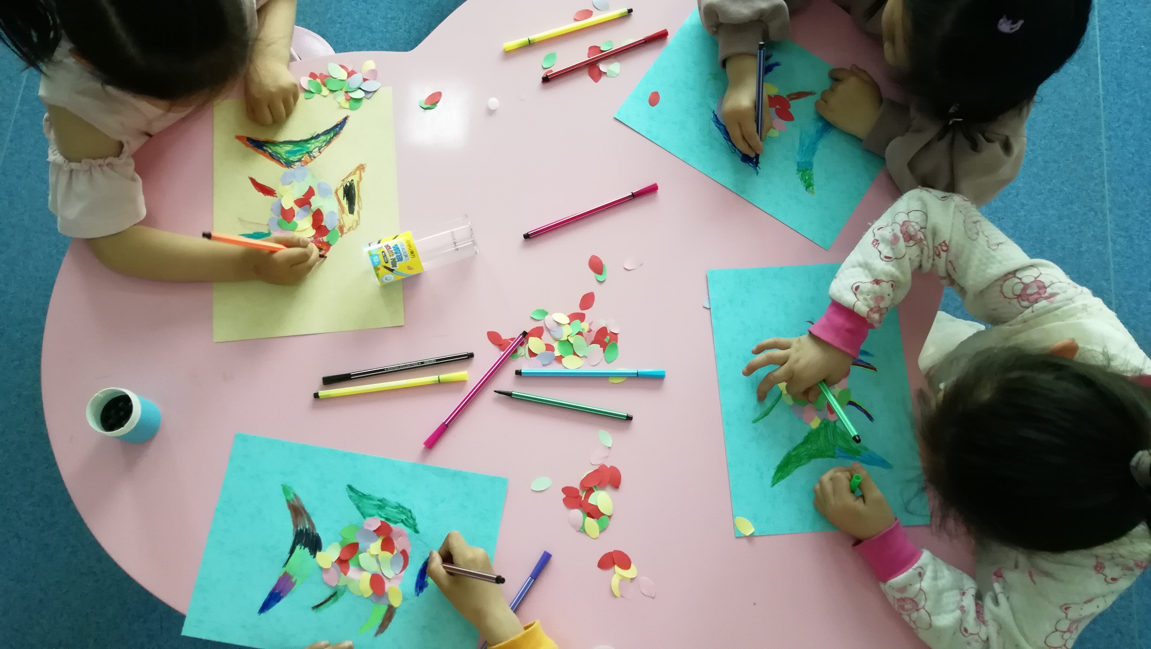 活動(dòng)提前準(zhǔn)備了各種顏色的彩紙和剪好圖形的彩色紙片。孩子們在悅悅姐姐指導(dǎo)下,做出了一條條色彩斑斕的彩虹魚,培養(yǎng)了孩子們動(dòng)手能力的同時(shí),也讓他們收獲了友誼和快樂。