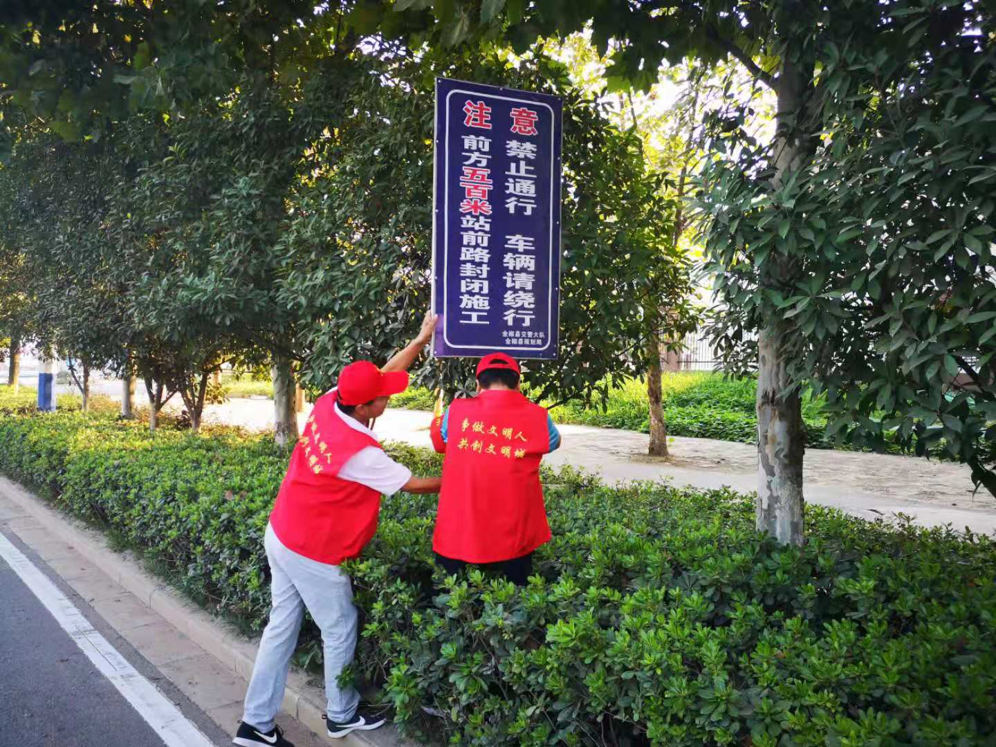 農(nóng)行對(duì)包保路段傾倒的交通標(biāo)志進(jìn)行扶正