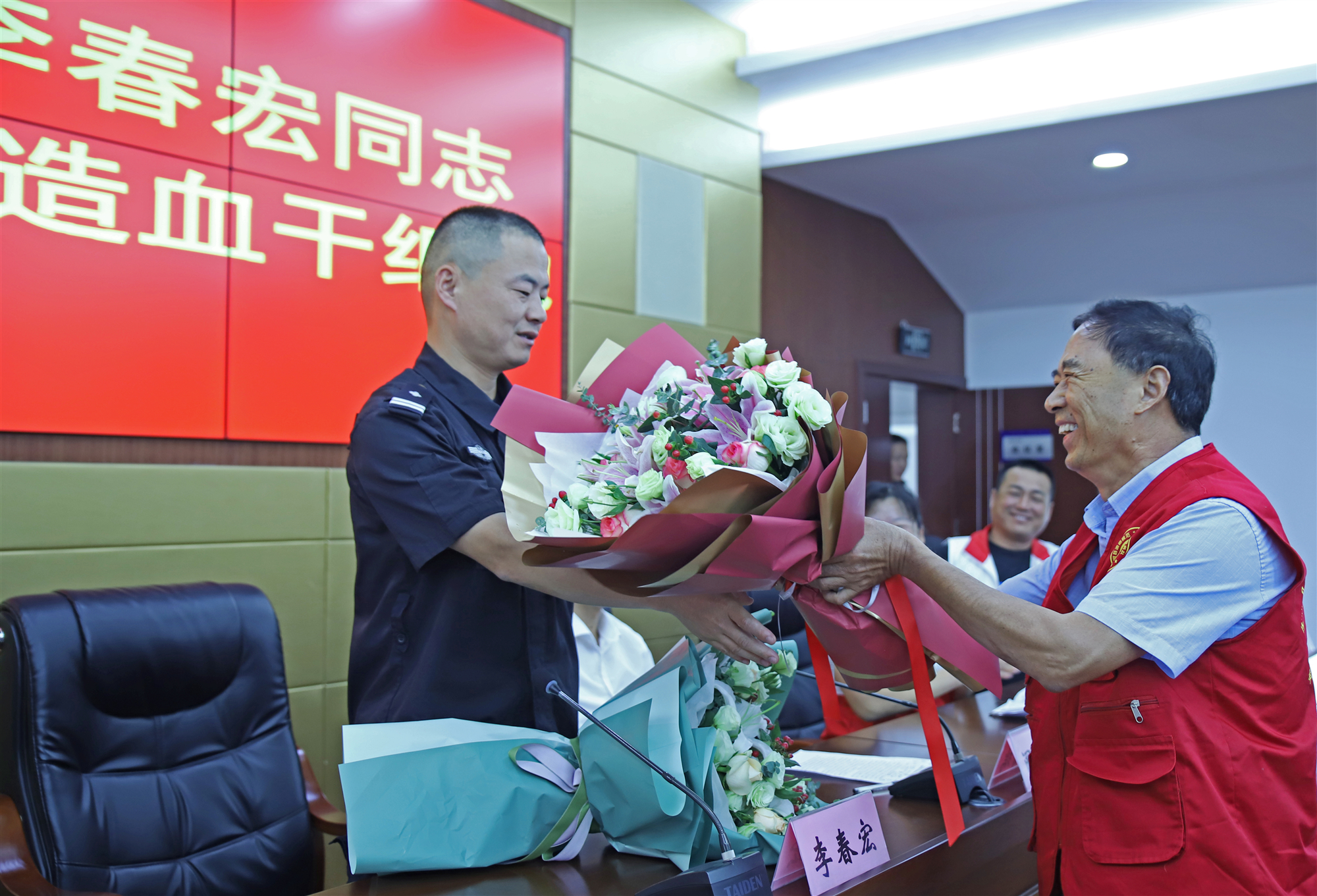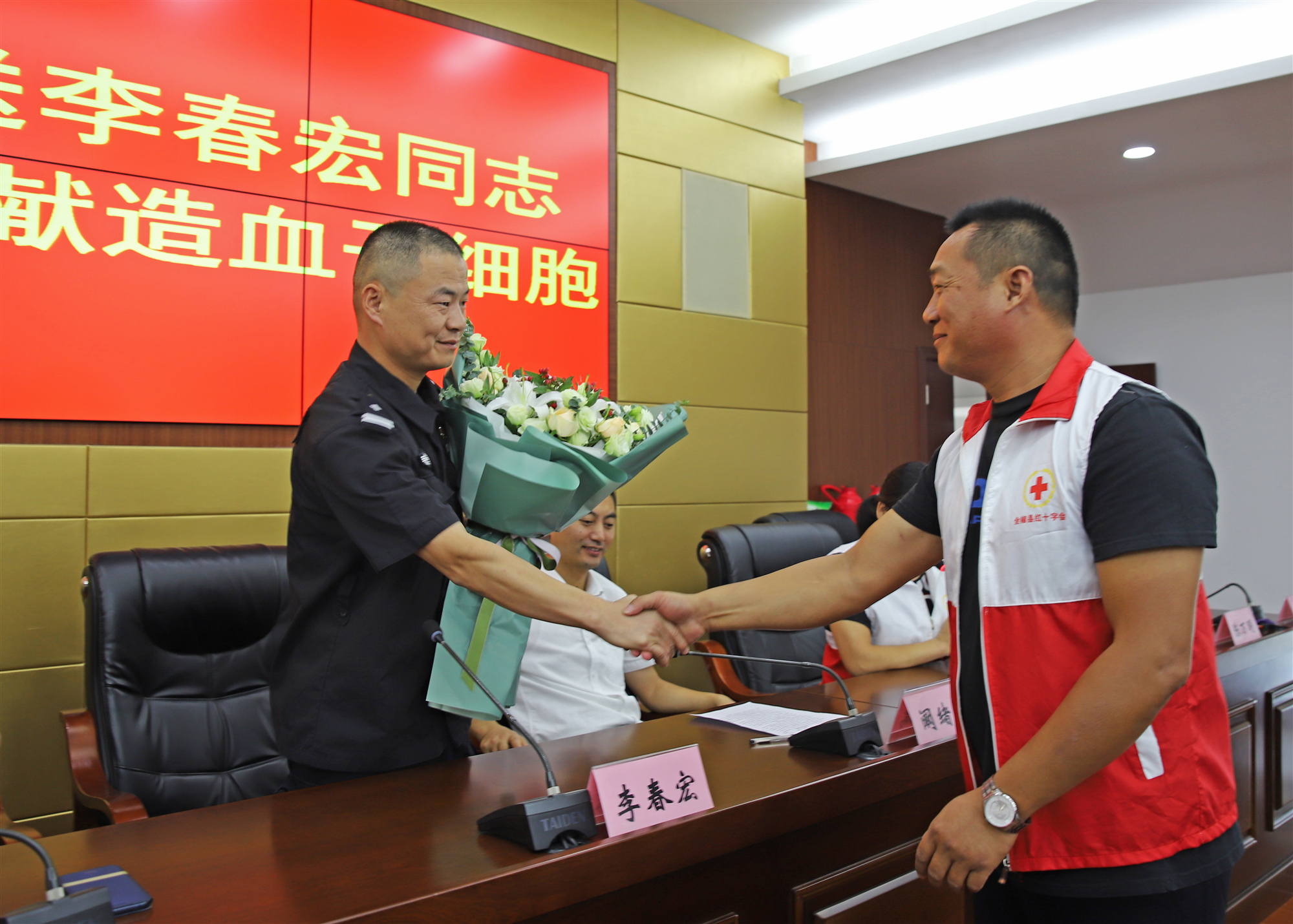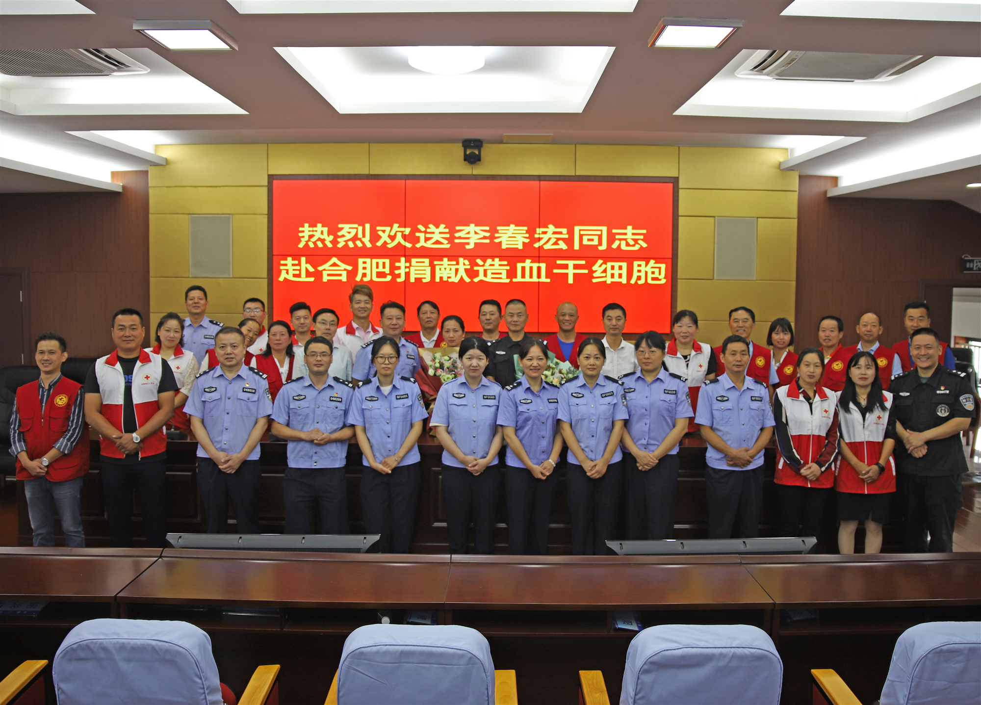 9月24日,全椒縣舉行了一場(chǎng)別樣的歡送會(huì),歡送全椒縣公安局特(巡)警大隊(duì)民警李春宏赴合肥省立醫(yī)院捐獻(xiàn)造血干細(xì)胞。臨近國(guó)慶,李春宏所在的巡邏防爆大隊(duì)各項(xiàng)工作任務(wù)格外重,但考慮受捐者的實(shí)際情況,單位領(lǐng)導(dǎo)還是對(duì)李春宏的工作任務(wù)進(jìn)行了調(diào)整,并在出發(fā)前安排了一場(chǎng)歡送會(huì)。當(dāng)天,全椒縣首例造血干細(xì)胞捐獻(xiàn)者陳萬明和部分造血干細(xì)胞志愿者以及全椒縣道德模范“星火燎原”志愿服務(wù)隊(duì)的部分隊(duì)員聞迅后也自發(fā)趕到歡送會(huì)現(xiàn)場(chǎng),為李春宏壯行。