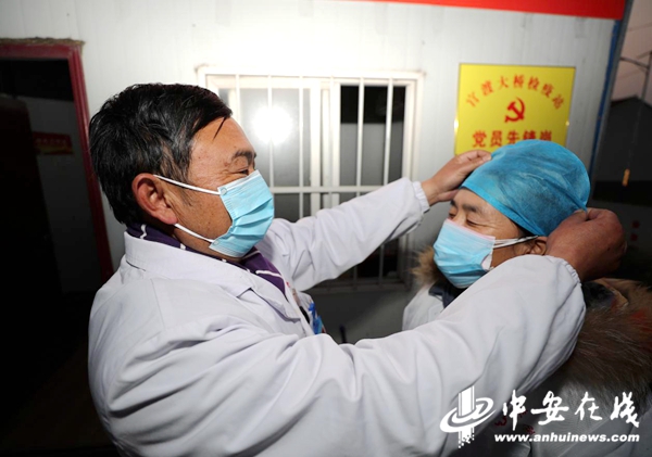 2月4日,全椒縣武崗鎮(zhèn)官渡村村醫(yī)劉金平在換崗時(shí)為妻子鄭桂霞整理帽子。沈果 攝