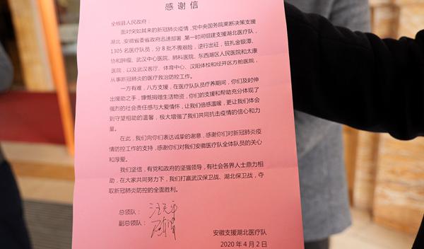 中安在線滁州訊 “我們向你們表達誠摯的謝意,感謝你們對新冠肺炎疫情防控工作的支持,感謝你們對我們安徽醫(yī)療隊全體隊員的關心和厚愛。”4月3日,全椒縣副縣長陳勁松從安徽支援湖北醫(yī)療隊總領隊、省血吸蟲病研究所所長汪天平手中接過了一封特殊的感謝信。