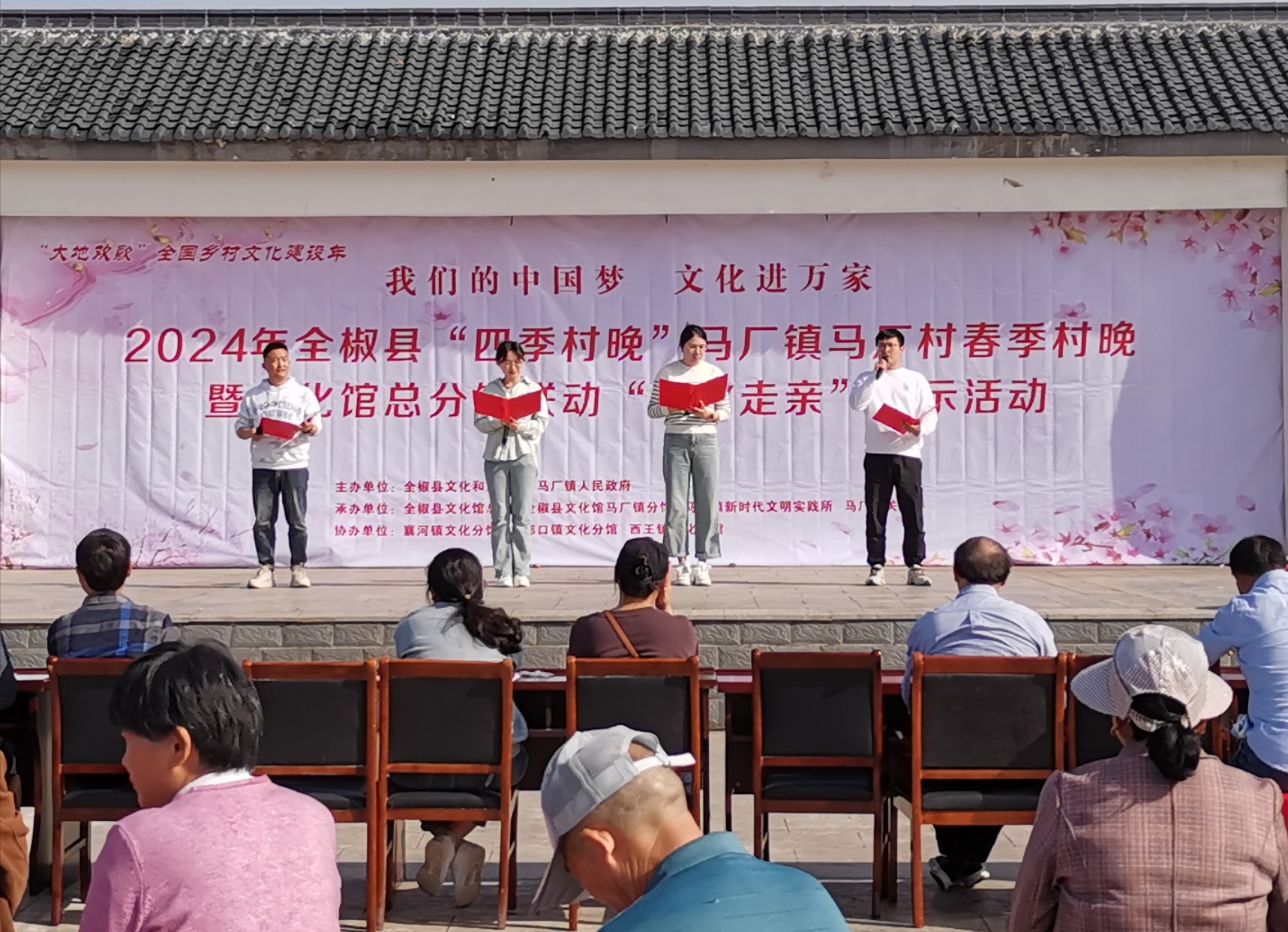 為激發(fā)鄉(xiāng)村振興的文化內(nèi)生動力,傳承與保護地方特色文化,豐富和活躍人民群眾精神文化生活,4月18日,2024年全椒縣“四季村晚”馬廠鎮(zhèn)馬廠村春季村晚暨文化館總分館聯(lián)動“文化走親”展示活動在馬廠鎮(zhèn)新時代文明實踐廣場舉行。