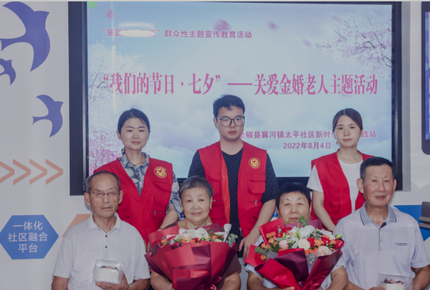 8月4日,襄河鎮(zhèn)太平社區(qū)舉辦“關(guān)愛金婚老人”七夕節(jié)主題活動(dòng)。志愿者邀請(qǐng)了兩對(duì)金婚老夫妻來到社區(qū),為老人送上了鮮花、蛋糕等節(jié)日禮物,為他們拍照留念,并聆聽了兩位老人在婚姻生活中感人經(jīng)歷。此次活動(dòng)展示了金婚老人良好的精神風(fēng)貌,以溫馨浪漫的方式讓老年人度過一個(gè)特殊的七夕節(jié)。不僅弘揚(yáng)了中華民族崇尚夫妻和睦、孝老愛親的傳統(tǒng)美德,也向當(dāng)代青年宣揚(yáng)了健康文明的家庭觀和婚戀觀。